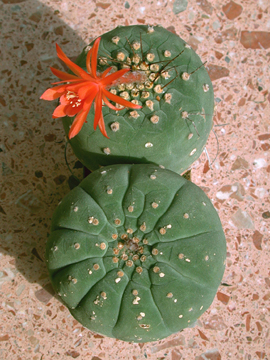 Solch eine Kaktee ist Matucana madisoniorum. Ihr ist es egal, ob die Sonne scheint oder ob der Himmel bedeckt ist, sie öffnet trotzdem ihre Blüten, wenn die Knospen "reif" sind, denn sie hat andere Bestäuber als die "Sonnenblüher". Meine beiden einzigen etwa gleichaltrigen Pflanzen aus unterschiedlichen Klonen (eine hat Dornen, die andere keine) stehen ein paar Zentimeter nebeneinander in eigenen Vierecktöpfen im Gewächshaus. Um den möglichen Auslöser "Nässe nach Trockenperiode" auszuschalten, wurden die Substrate gleichmäßig feucht gehalten. Das erste Mal blühten die beiden Matucana am 10.6.2011 simultan (Bild 1). Das zweite Mal blühten sie am 9.7.2011 (Bild 2) und das dritte Mal am 3.8.2011 gleichzeitig (Bild 3).